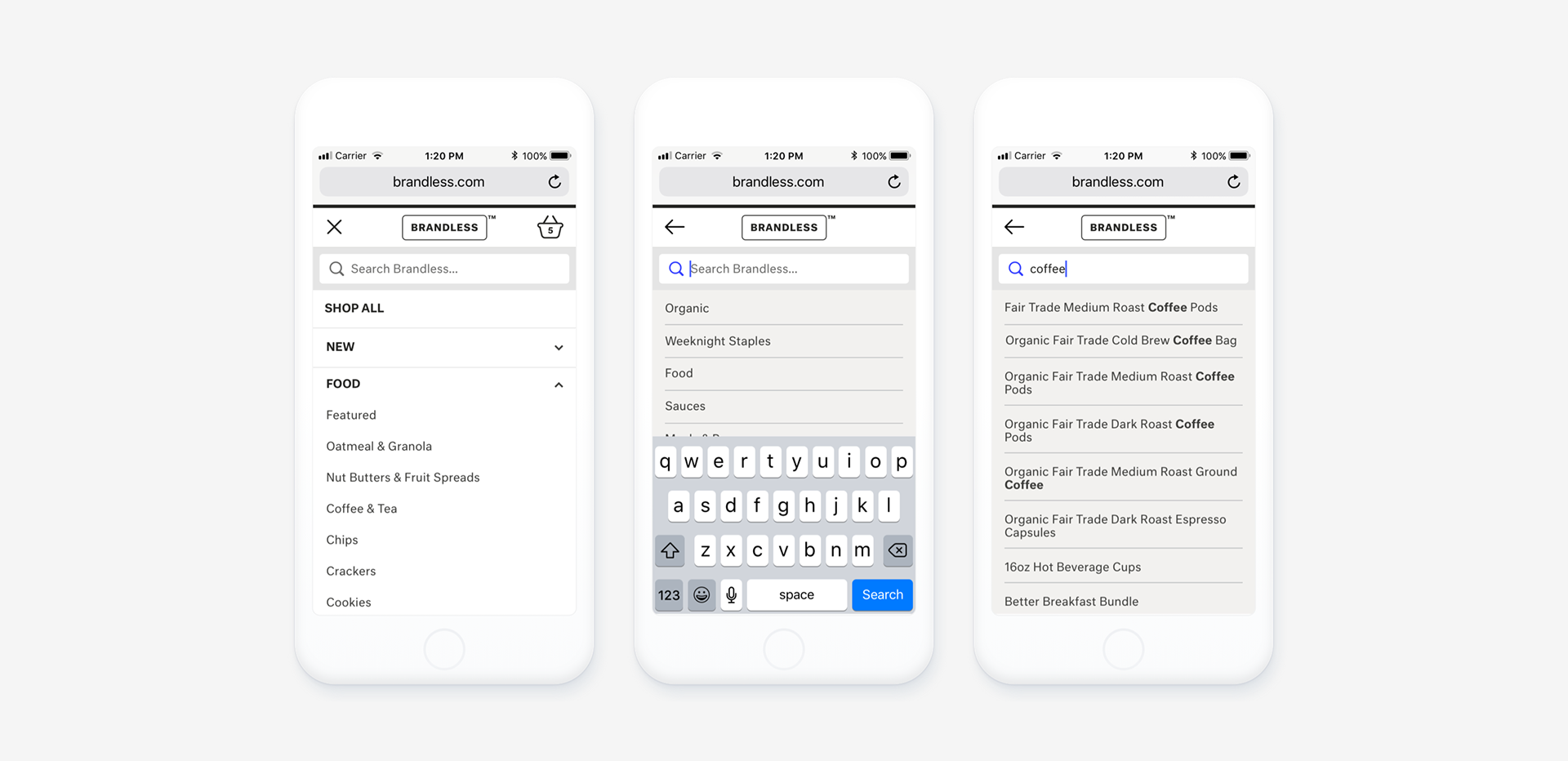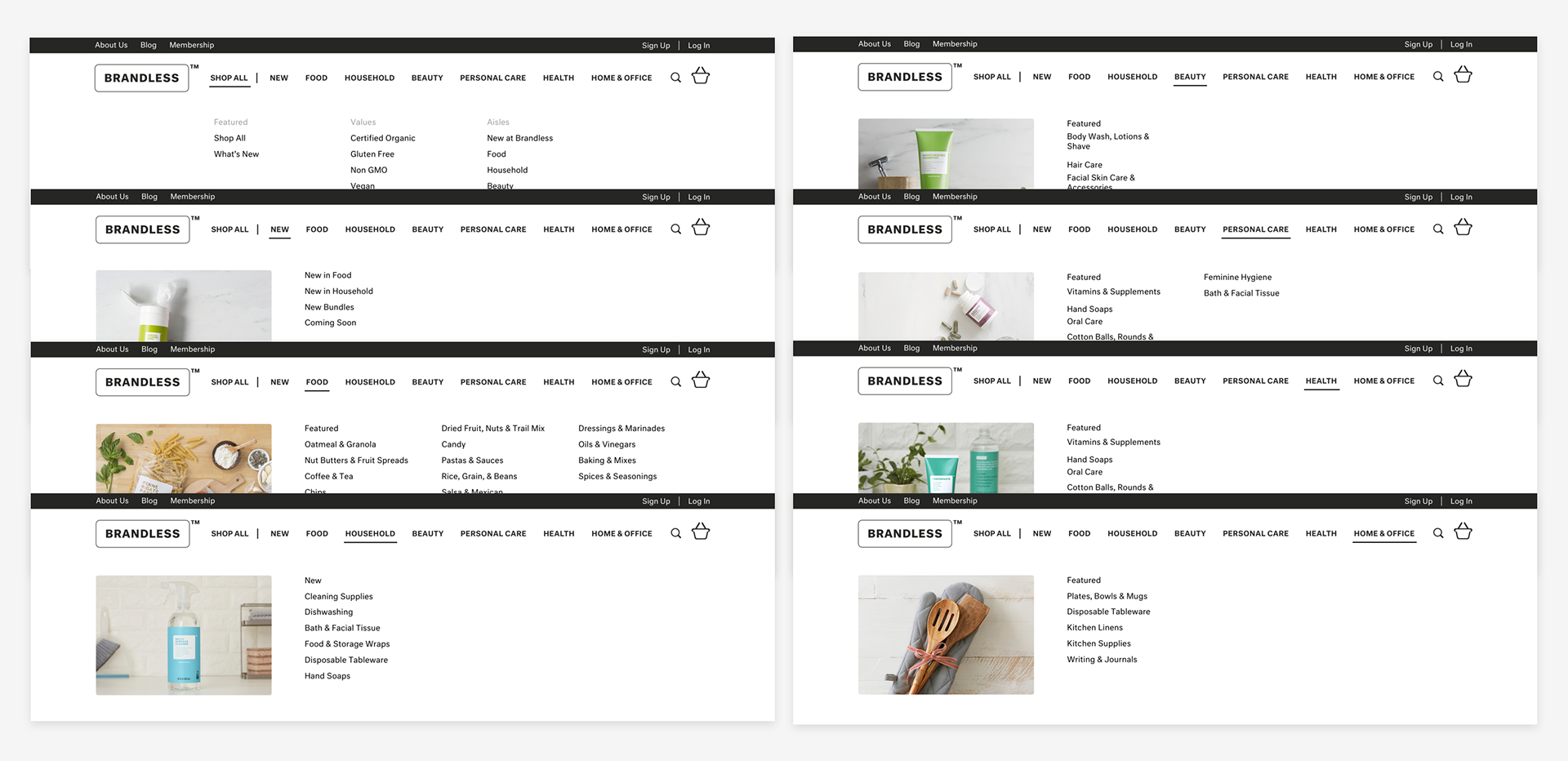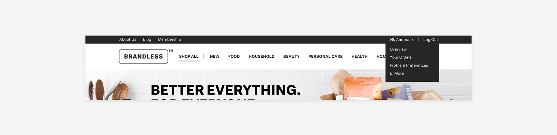 When I joined Brandless, the scale at which the business was hoping to grow began to require a more scalable user experience that housed what product existed at the time, but also considered what will exist in the future. I redesigned the site global navigation to be a full-width, multi-column layout. In doing this, I created a brand new location for product photography, to bring more color and better represent the category the user had open. I worked with site merchandisers on reducing duplicative taxonomy and strategized with the creative team on the types of photography to use in these dropdowns. I also redesigned the way a user's account shows, giving them upfront options to select from to better streamline their account needs.
