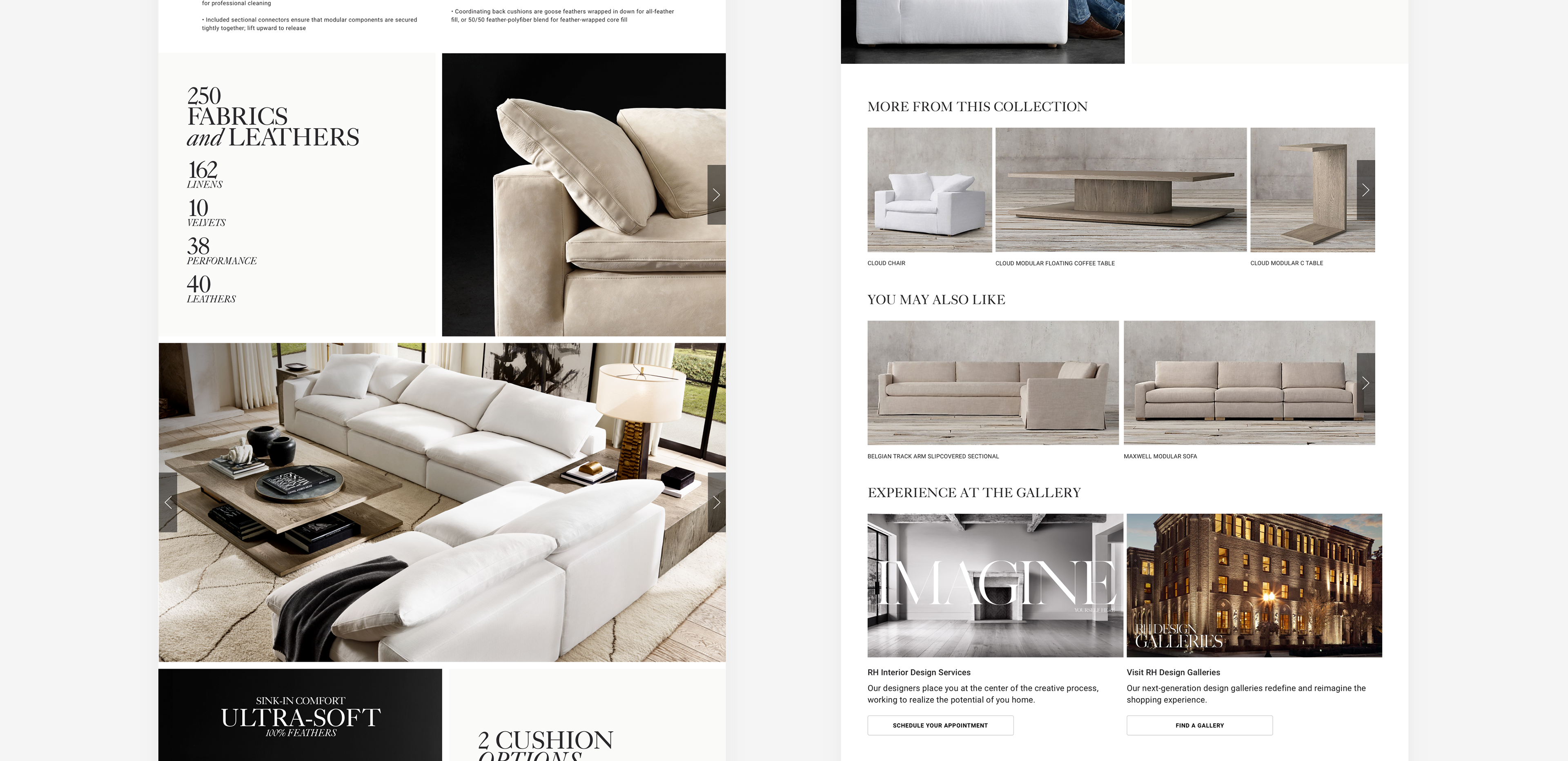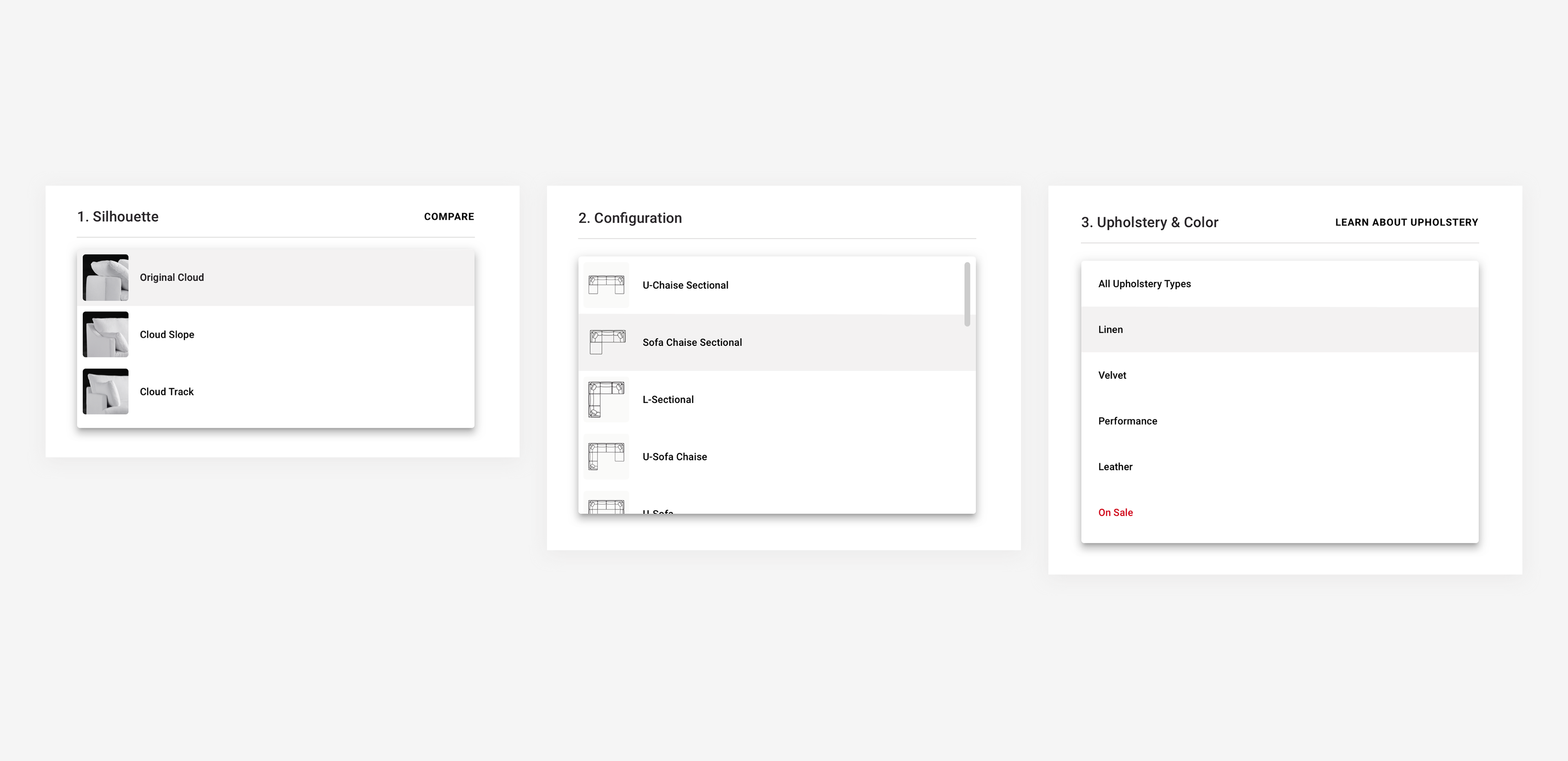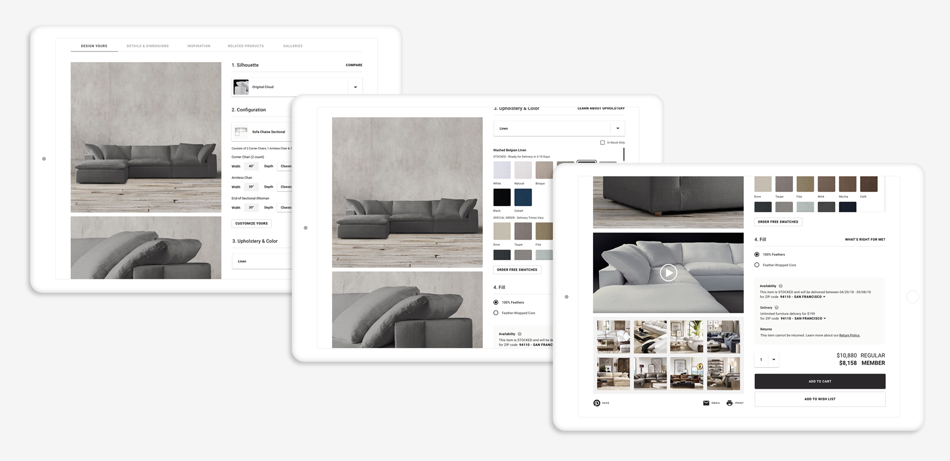 Restoration Hardware was looking to completely overhaul their early 2000s site experience, starting with path-to-purchase. The product page concept was created to house all the multitude of configurability options the RH was known for in-stores, but making it usable for the digital buyer. It was a unique balance of functional UI elements for choosing silhouette, configuration, fabric type and color, length, etc as well as form; the page features large hero images as well as rich content drawn straight from the infamous RH catalog. Since configuration options differ with each category of furniture, the right column had to support this in scale while still maintaining a view of the hero images on the left. So we had two separate column scrolls to support this. We also used a sticky top nav for the customer to hop between sections more easily as they scrolled. I also designed a brand new shipping section and additional product carousel to encourage browsing, as well as placements for video content to highlight RH's artistry.