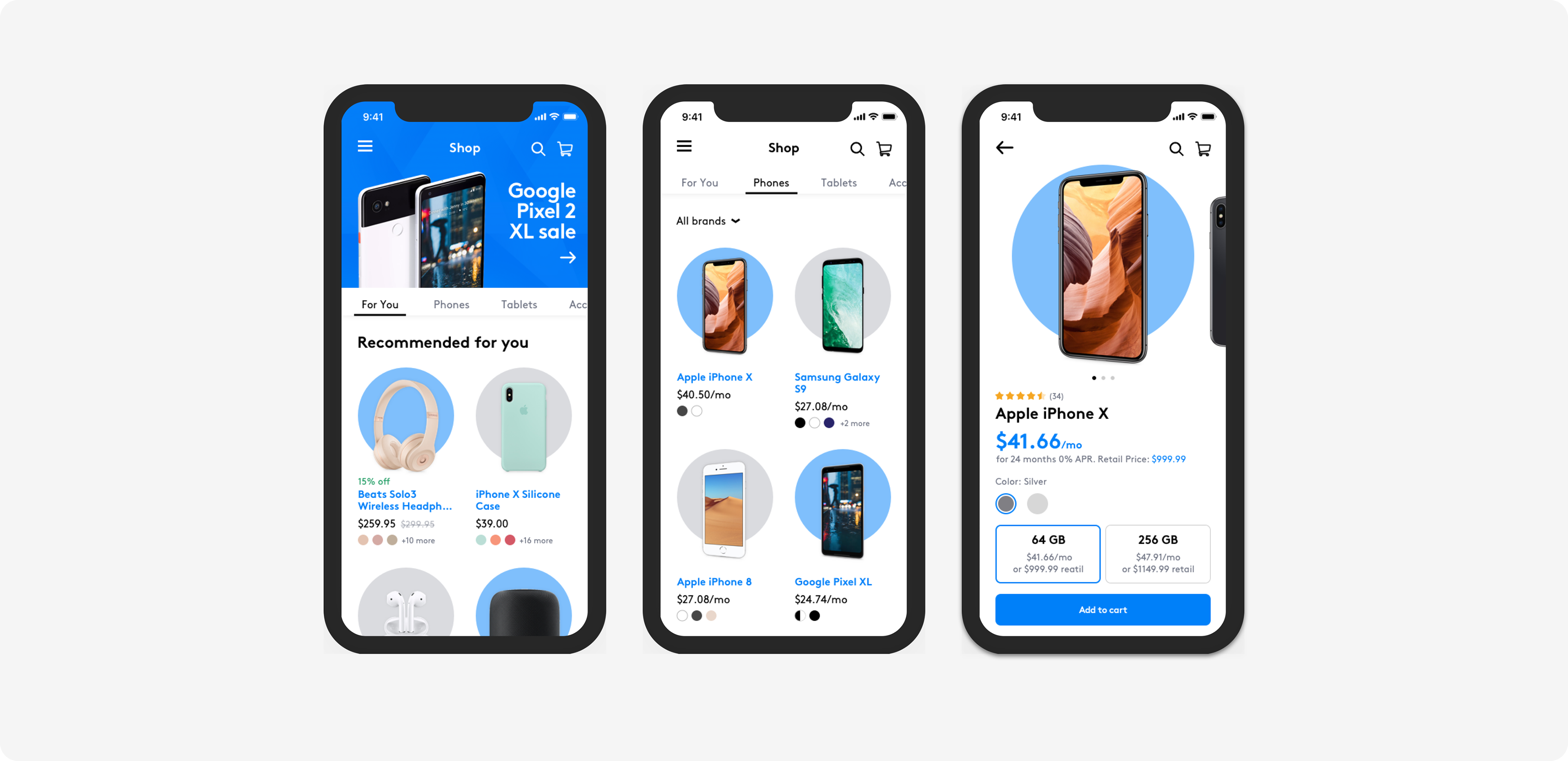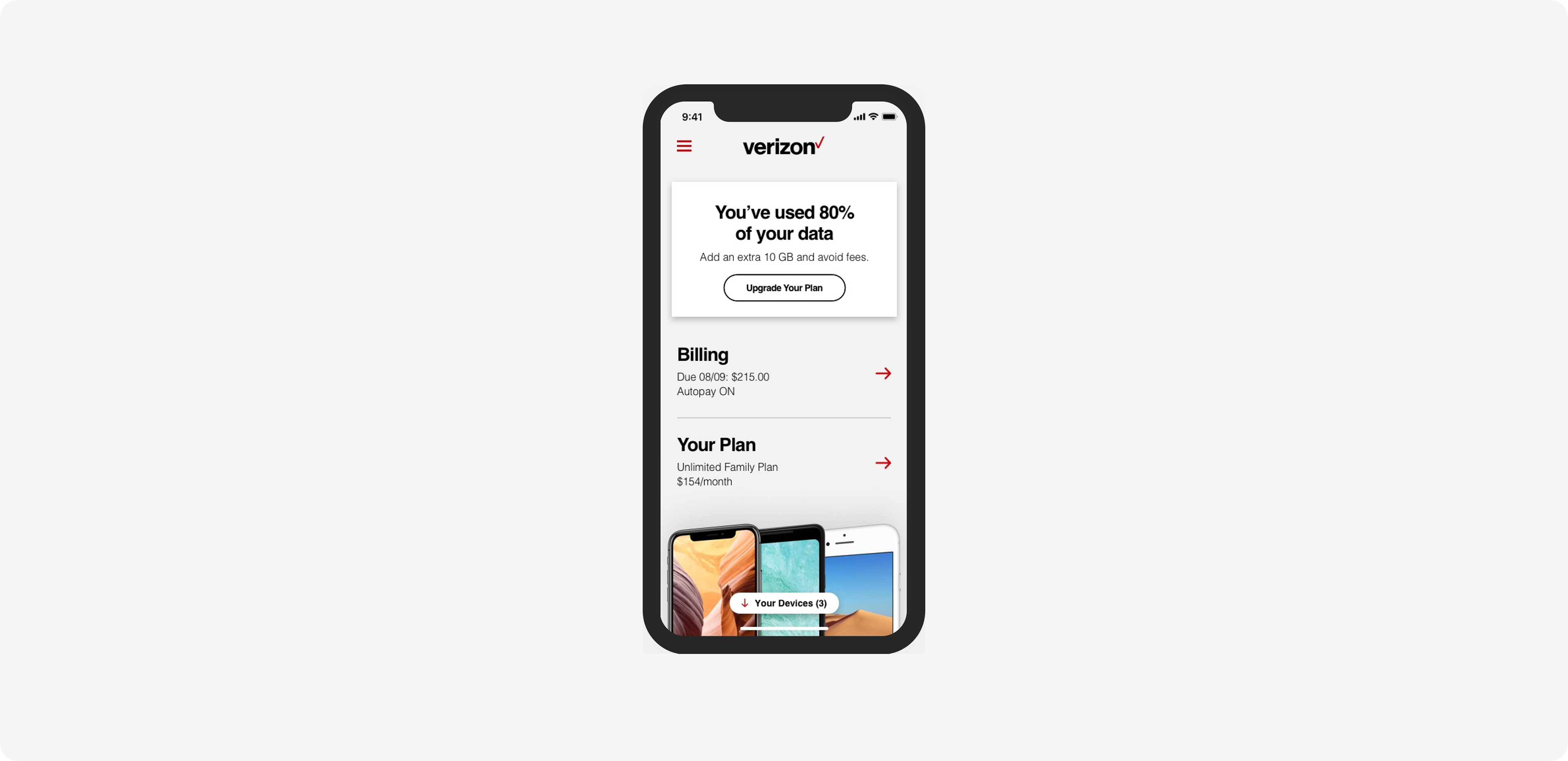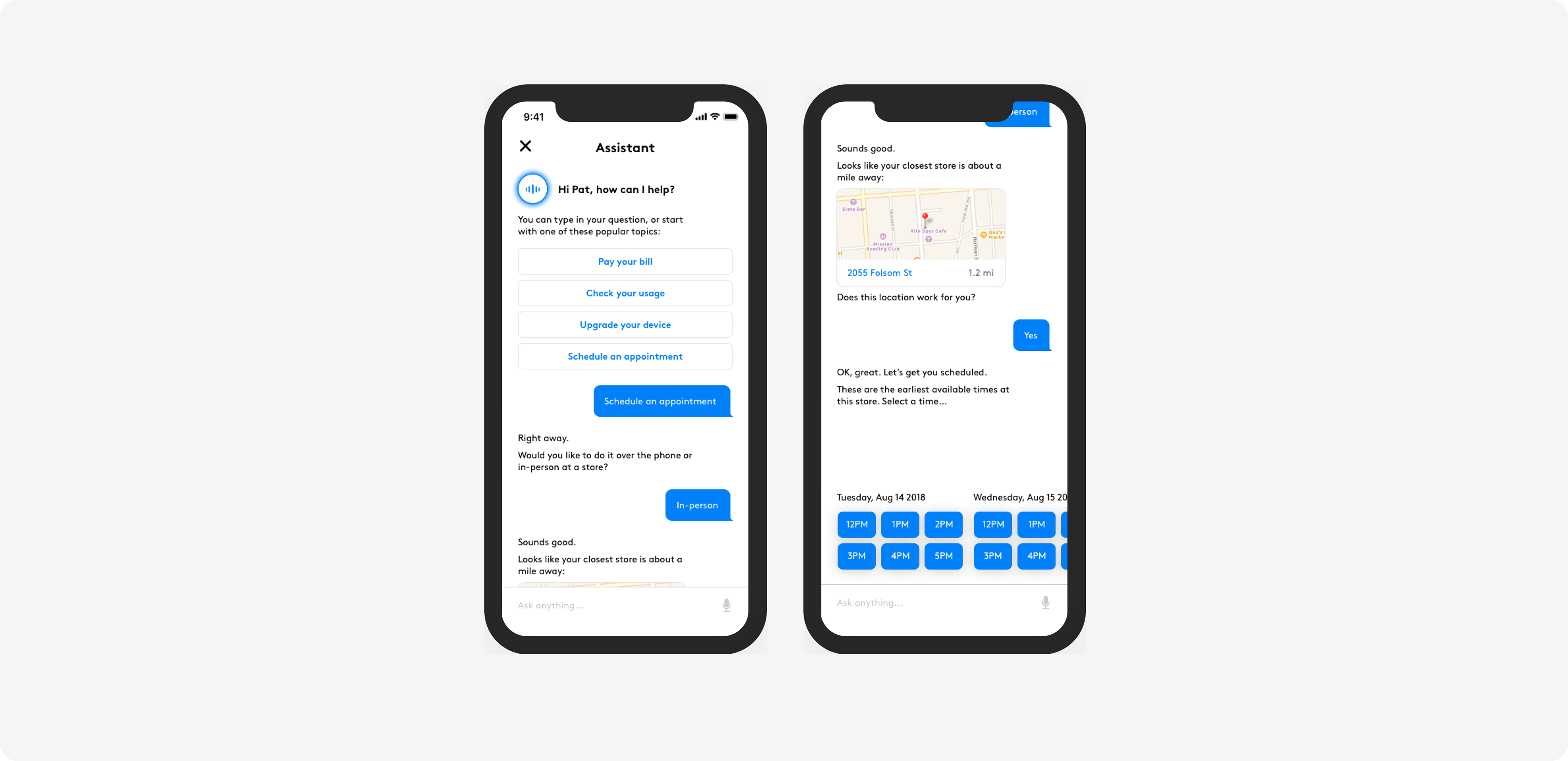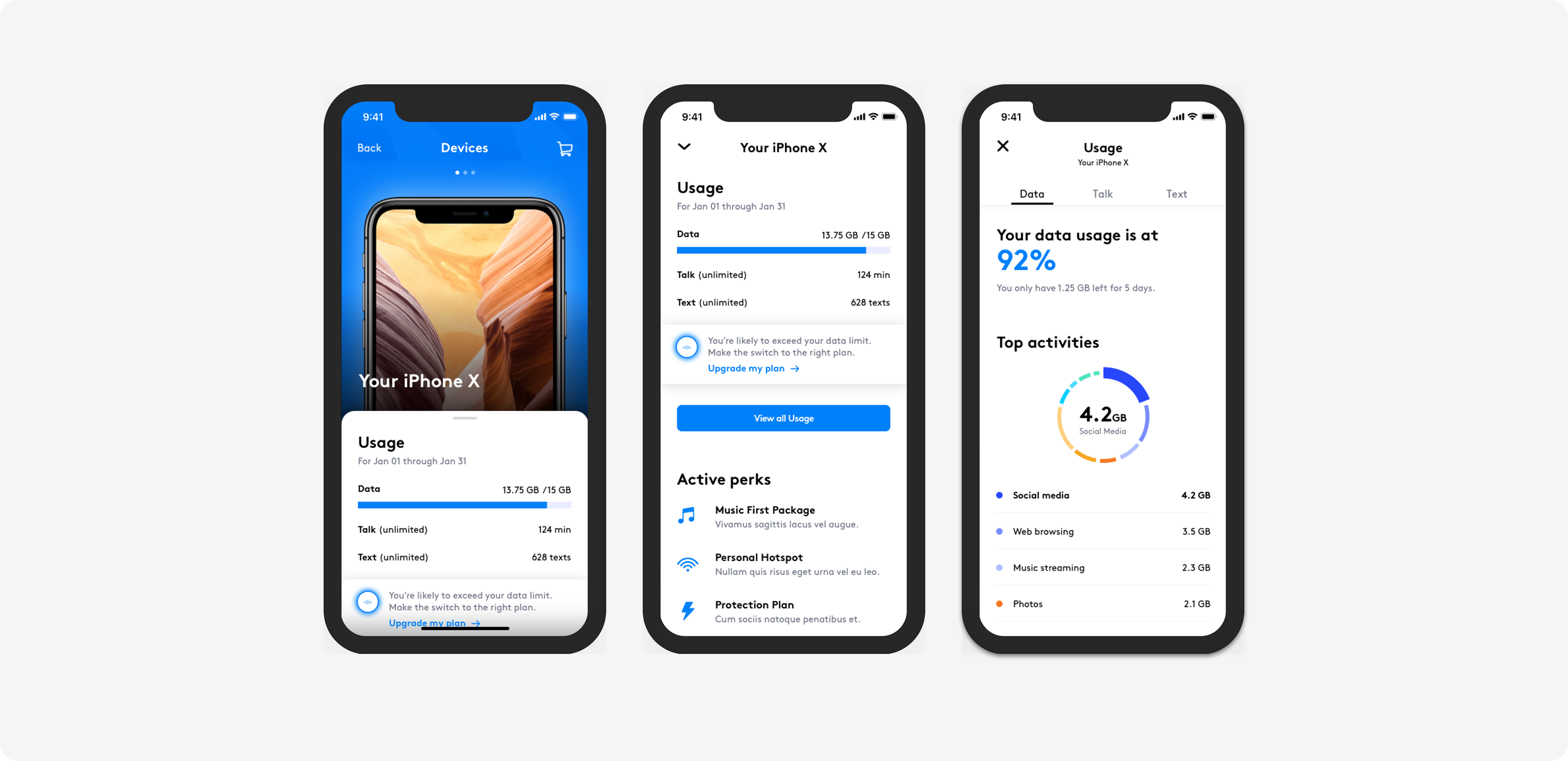 I worked as lead visual designer for this project helping Vlocity created a consumer app experience for businesses to license and use to better offer services to customers. The app, shown here being leveraged for a telecom provider, has three major pieces: device/service overview with usage features, a interactive chatbot, and an e-commerce shop.